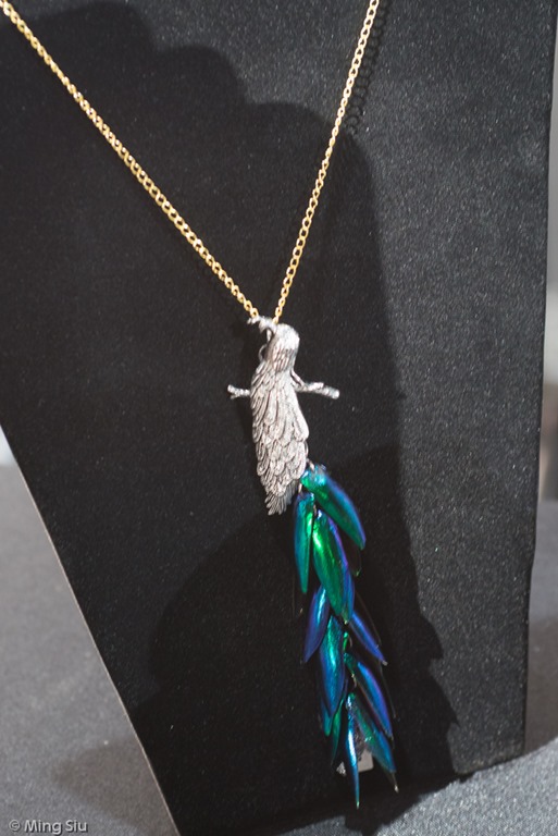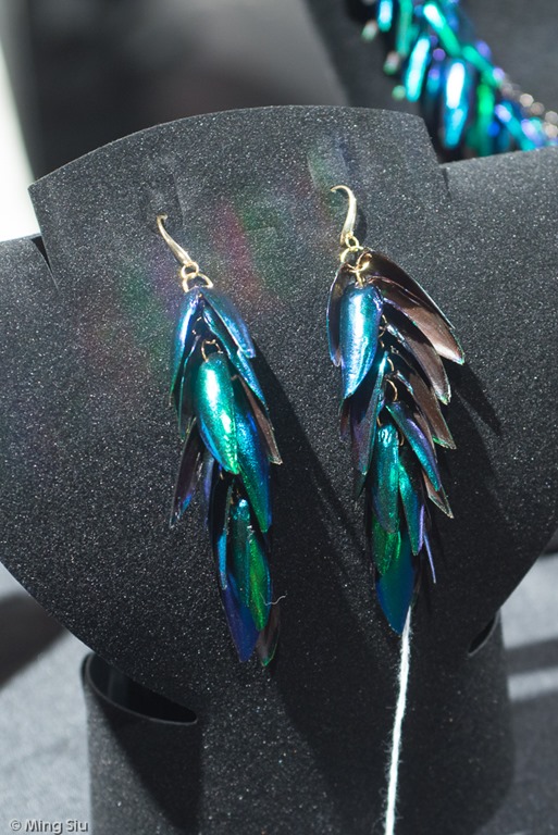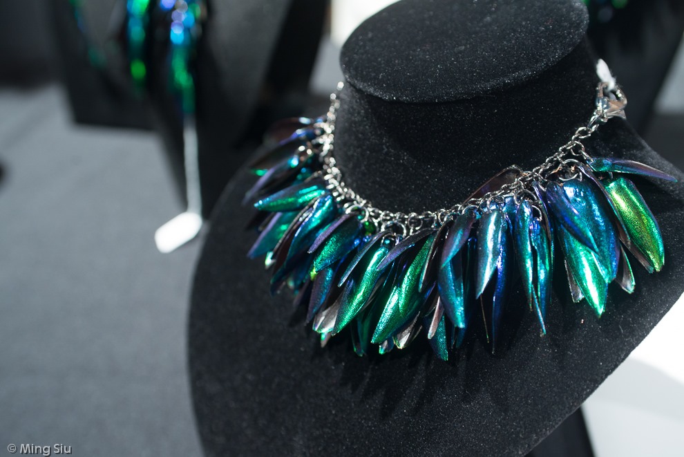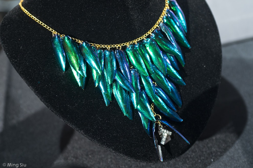 Elizabeth and her ET line of jewellery are using multi-coloured iridescent beetle wings as one of the main design element of this collection